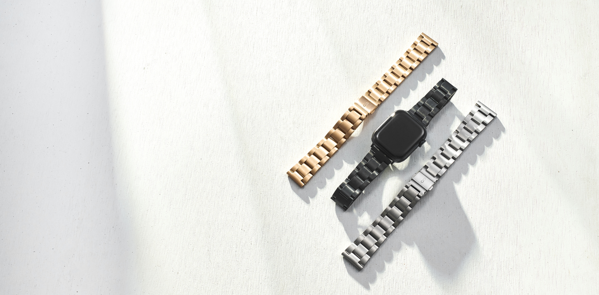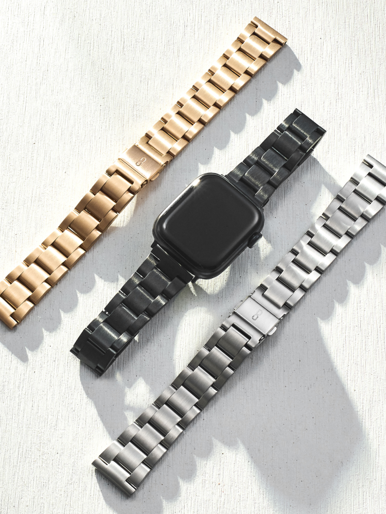 シルバー、ローズゴールド、ブラックの3色展開。ベーシックな3連ブレスは、シンプルな文字板をより上品に引き立てます。