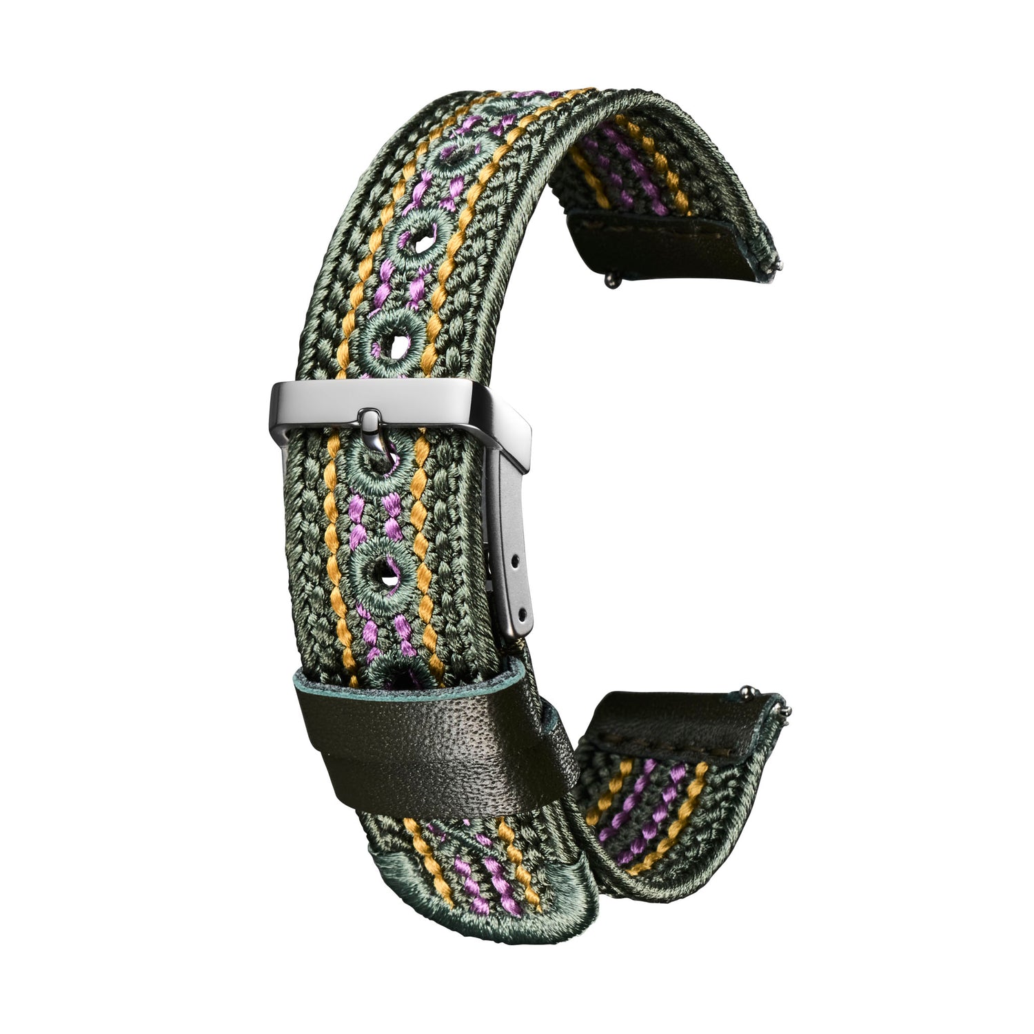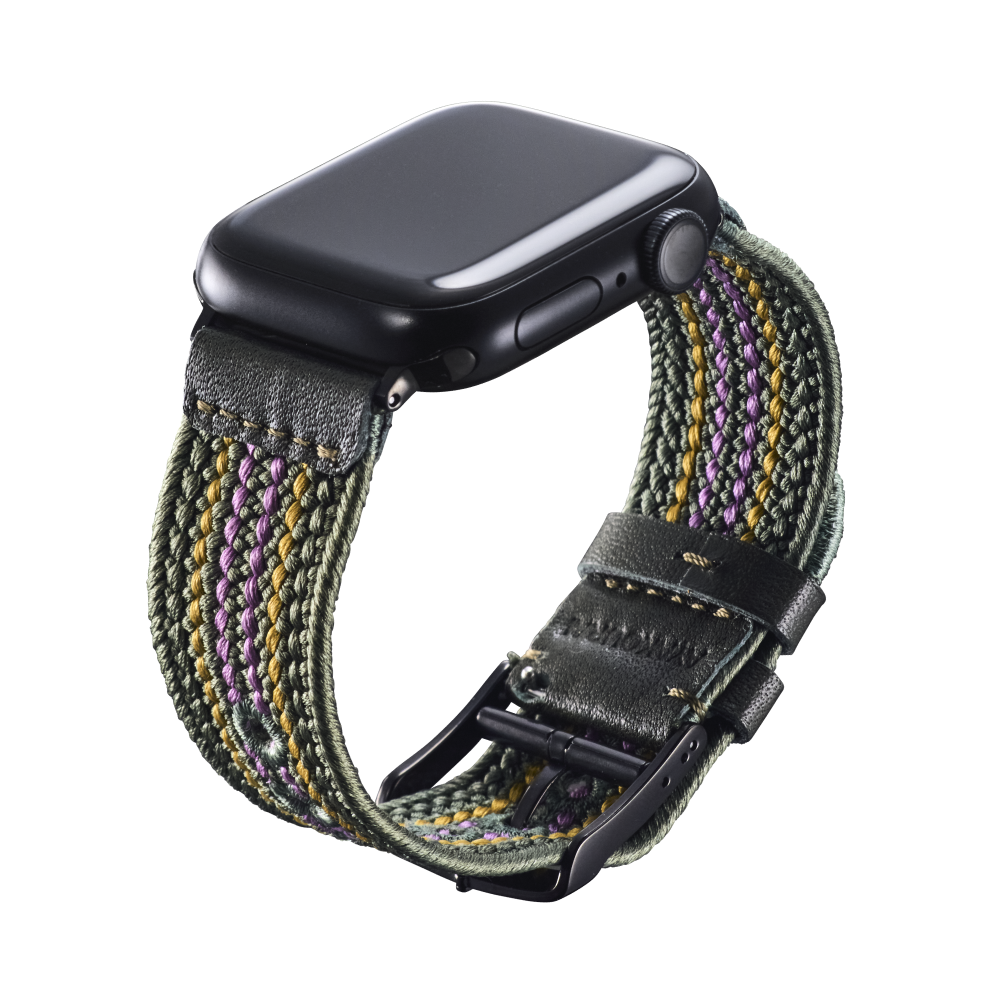 京都の「昇苑くみひも」独自の技術により、「綾」と呼ばれるストライプの縦模様をデザインに取り入れた「綾高麗」が、Knotのベルトになりました。時計のベルトは、ほかの工芸品に比べて必要とされる幅が広く、最初の構想から完成に至るまで時間を要しました。防水レザーと組み合わせることで水に強い、洗えるベルトとなっています。