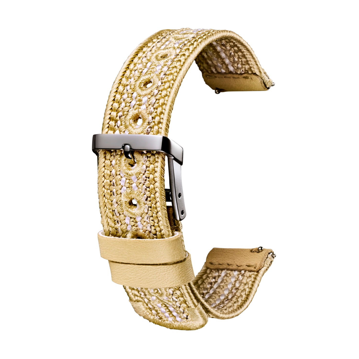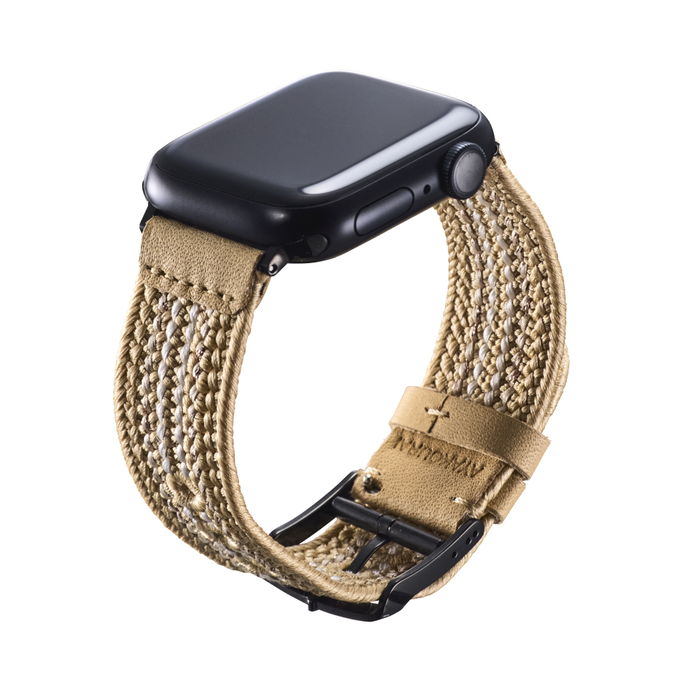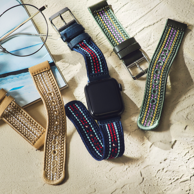 京都の「昇苑くみひも」独自の技術により、「綾」と呼ばれるストライプの縦模様をデザインに取り入れた「綾高麗」が、Knotのベルトになりました。時計のベルトは、ほかの工芸品に比べて必要とされる幅が広く、最初の構想から完成に至るまで時間を要しました。防水レザーと組み合わせることで水に強い、洗えるベルトとなっています。