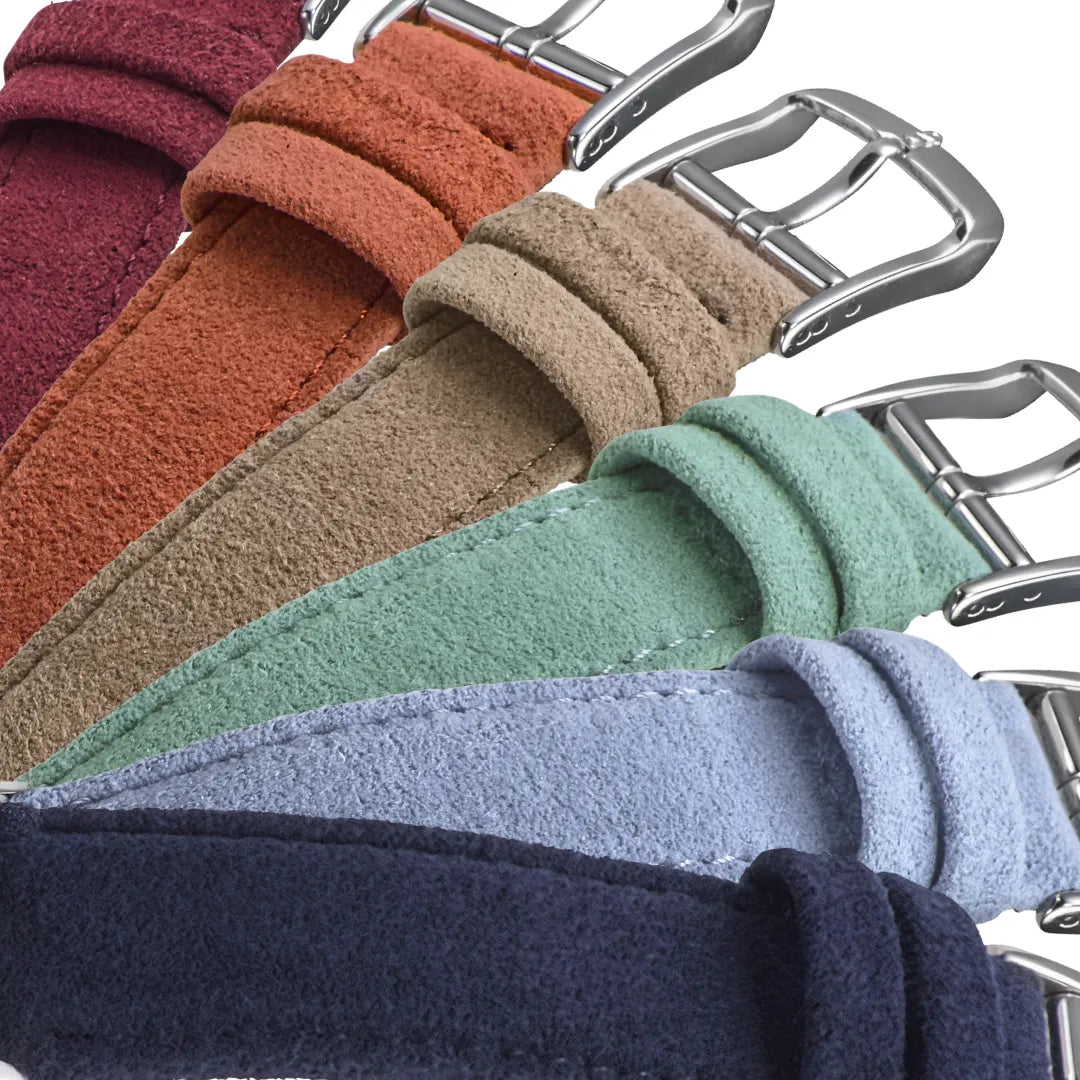 腕元から季節をまとうように、あたたかみを感じる質感と華やかなカラーバリエーションで冬のコーディネートの主役になるストラップ。ウルトラスエードは、天然スエードの風合いはそのままに、着け心地や耐久性にも優れた、機能性素材です。