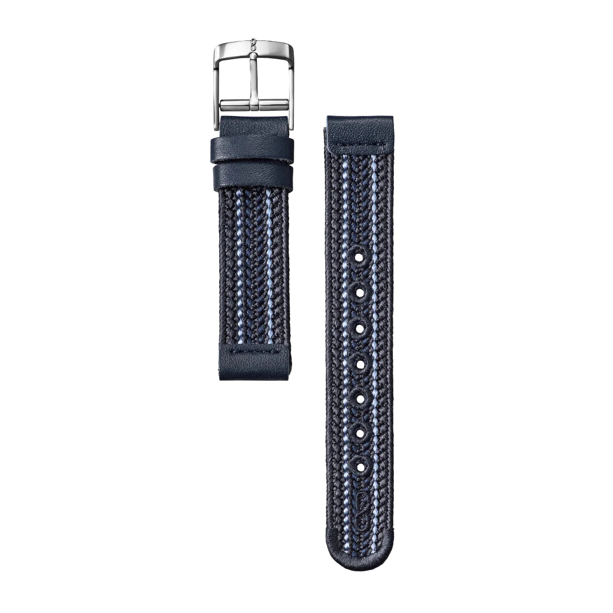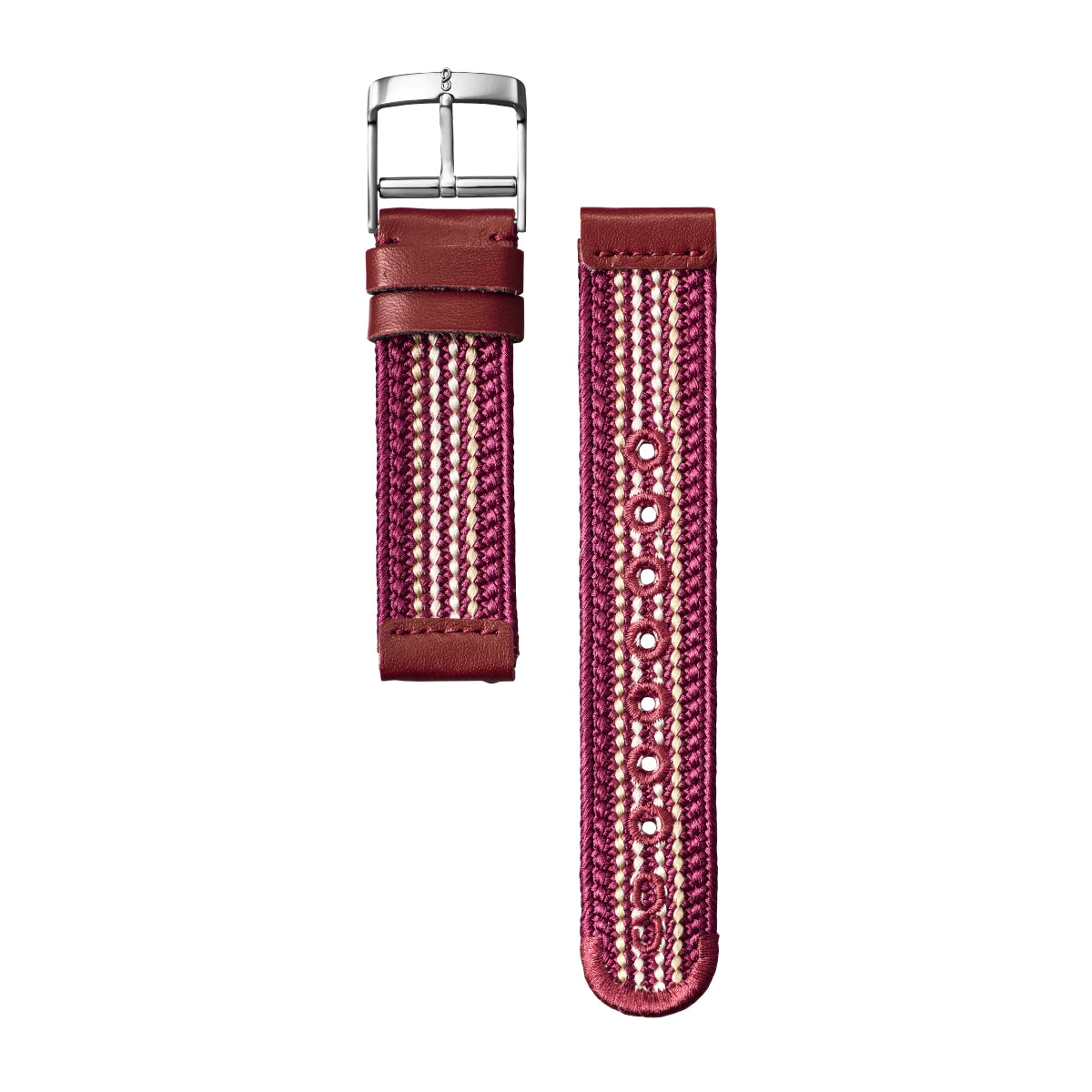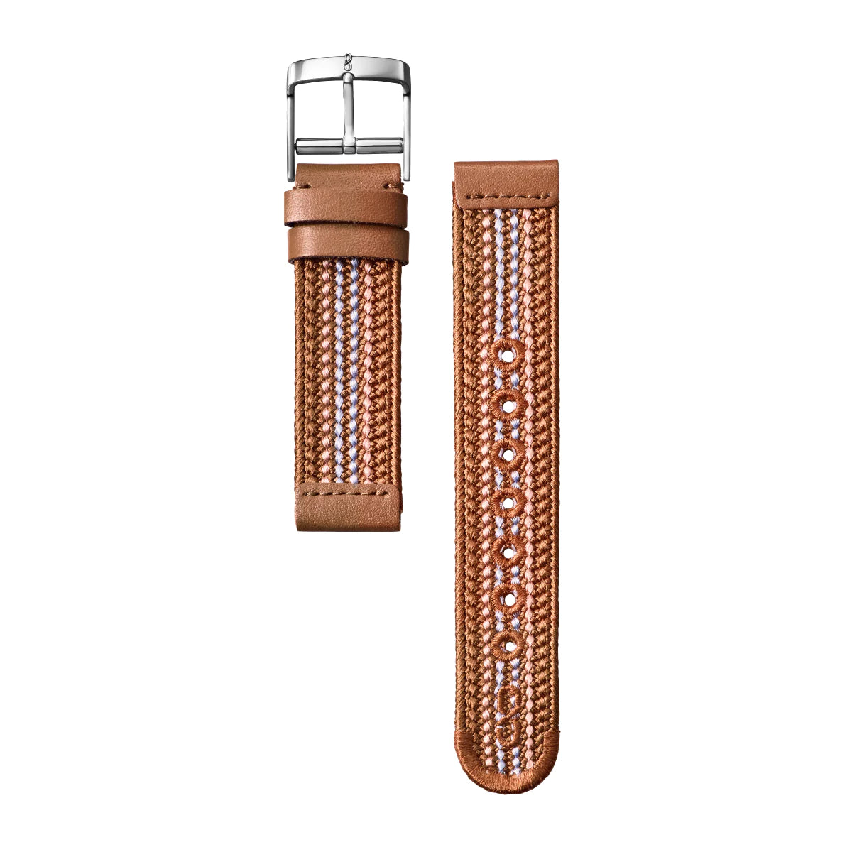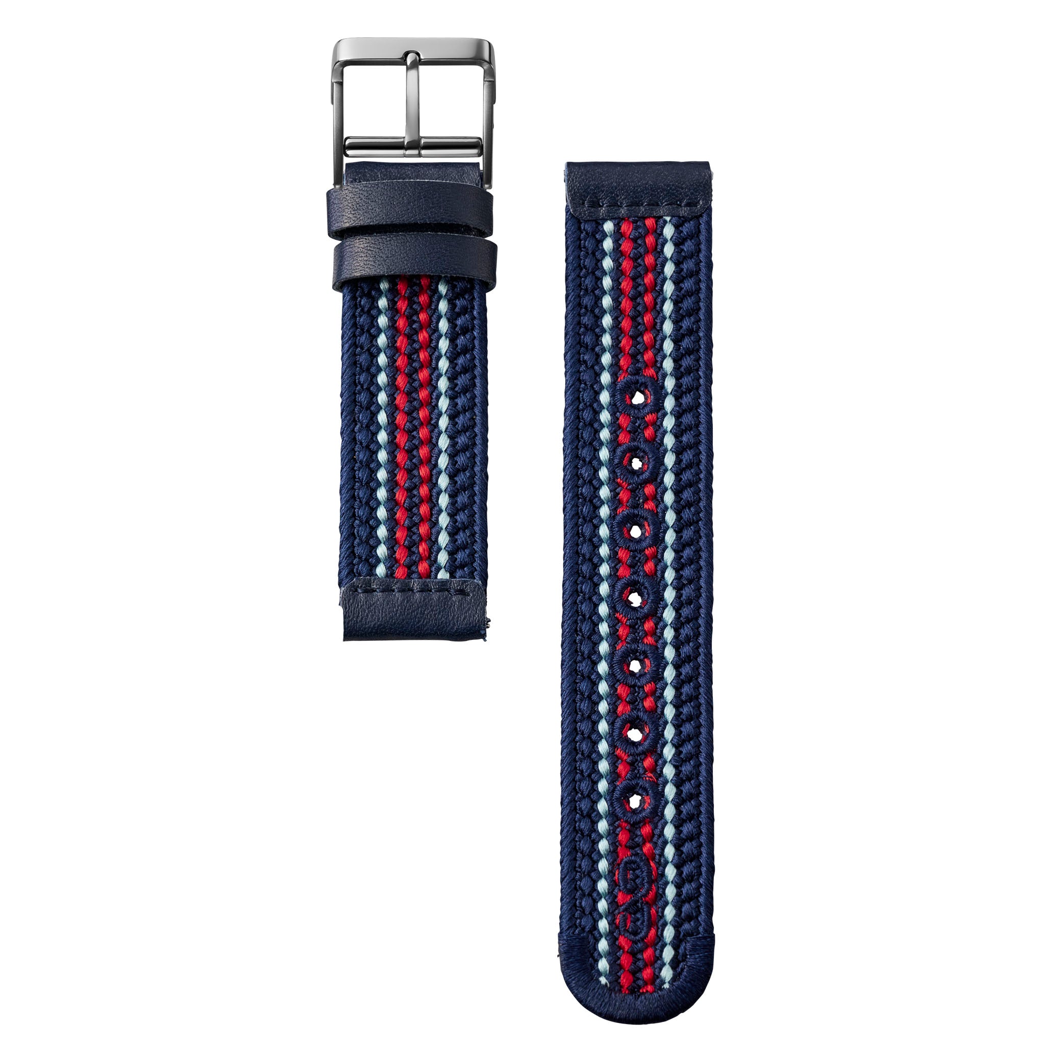 京都の「昇苑くみひも」独自の技術により、「綾」と呼ばれるストライプの縦模様をデザインに取り入れた「綾高麗」が、Knotのベルトになりました。時計のベルトは、ほかの工芸品に比べて必要とされる幅が広く、最初の構想から完成に至るまで時間を要しました。防水レザーと組み合わせることで水に強い、洗えるベルトとなっています。