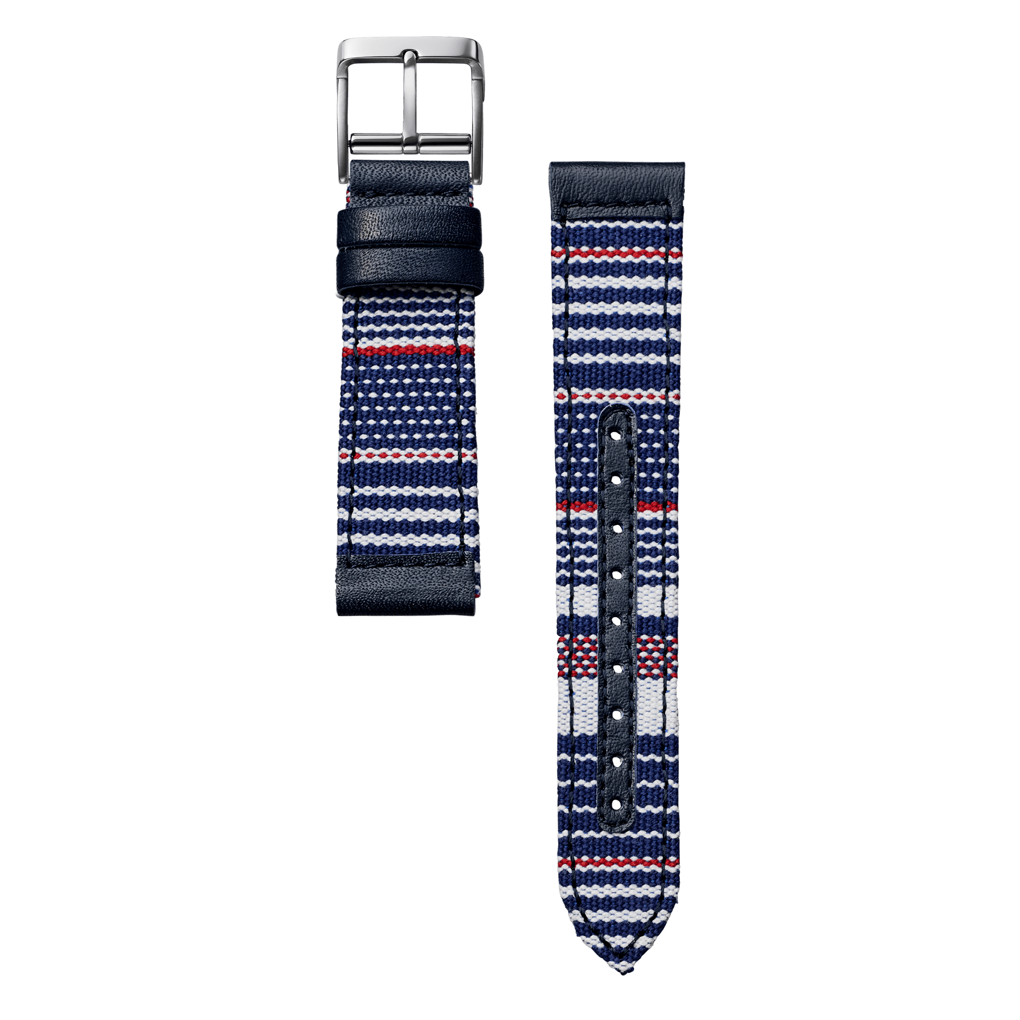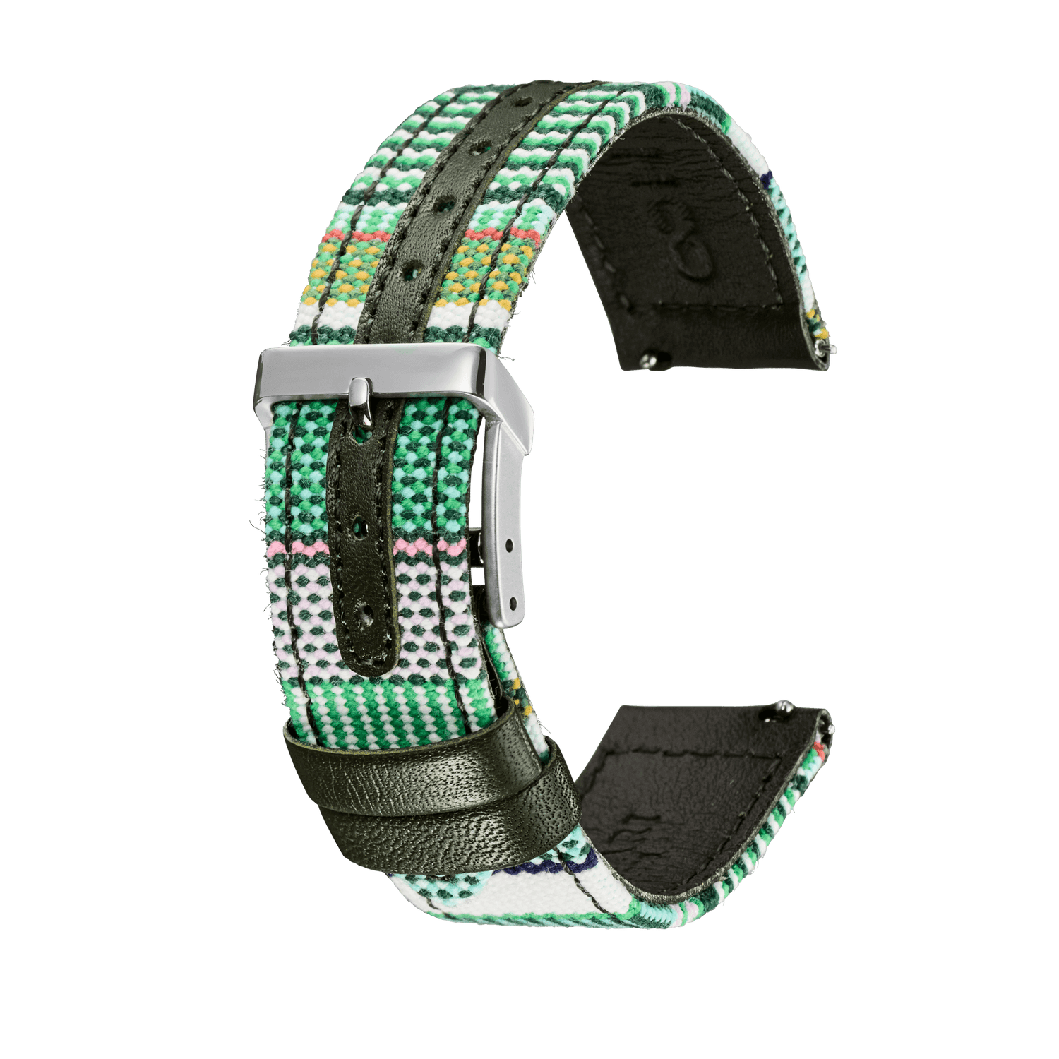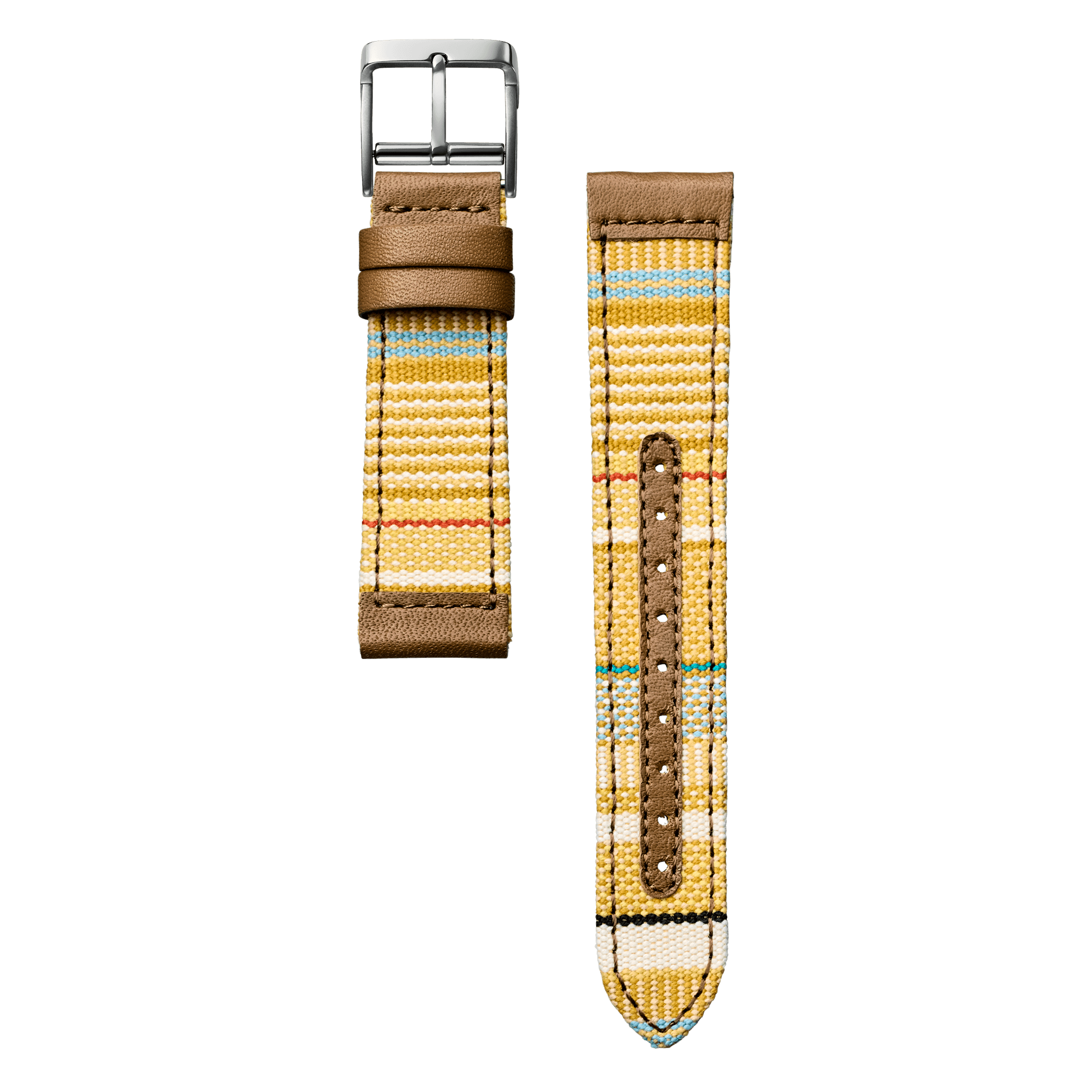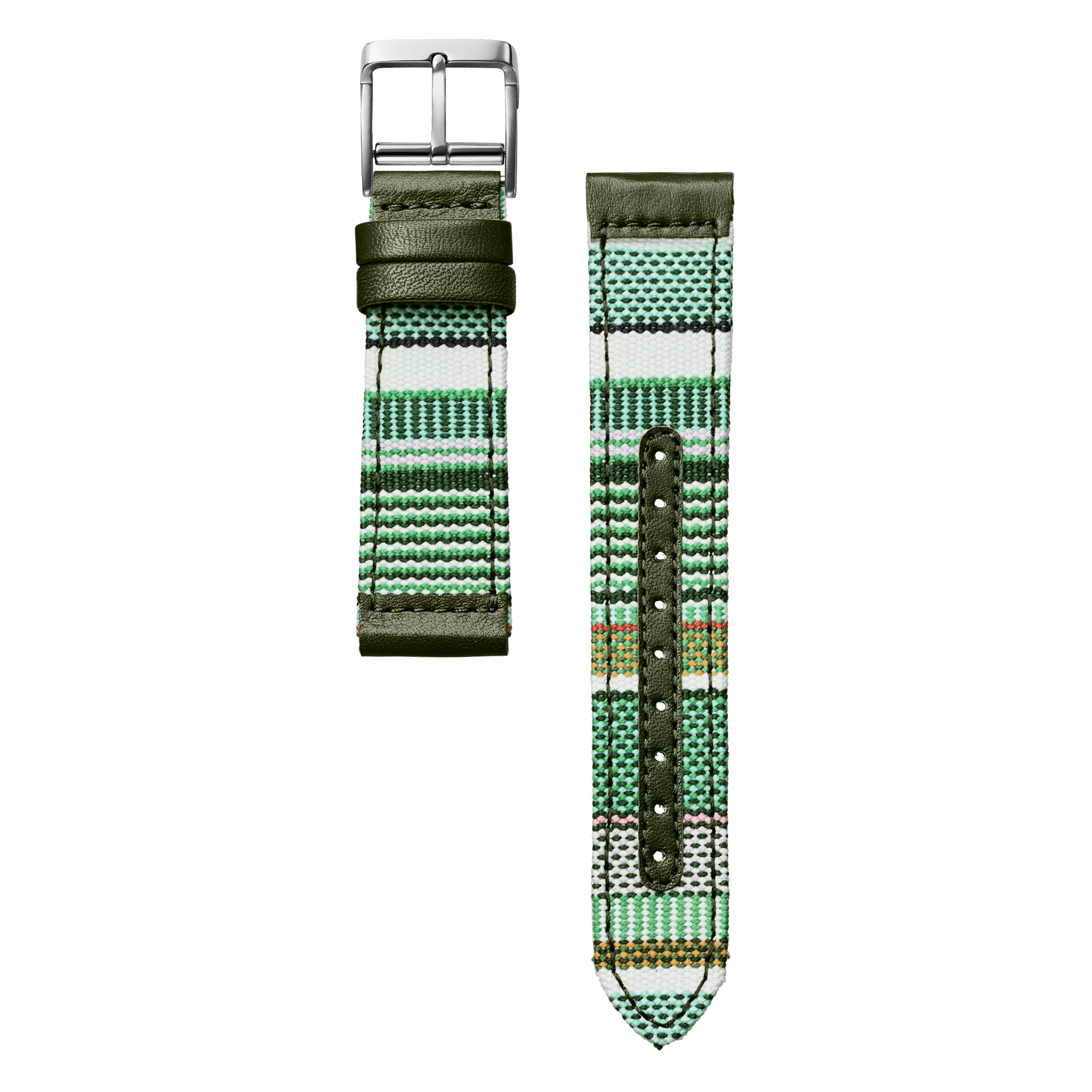 アウトドアファッションで人気のマルチストライプを採用したカジュアルデザインの帆布ストラップです。