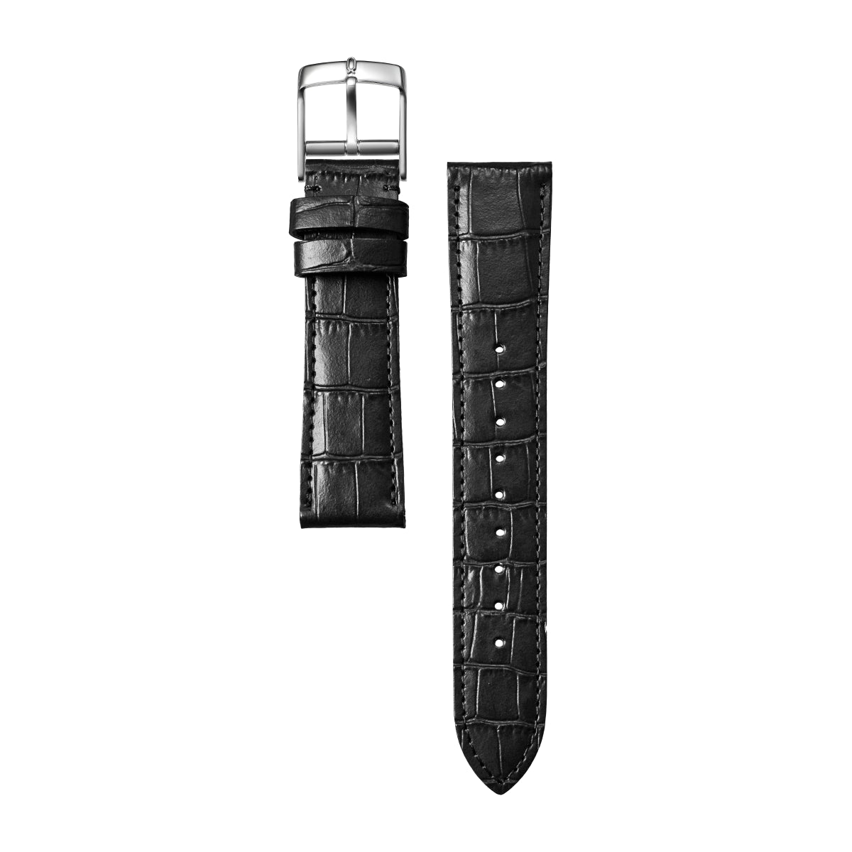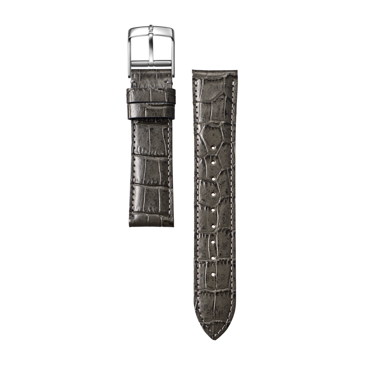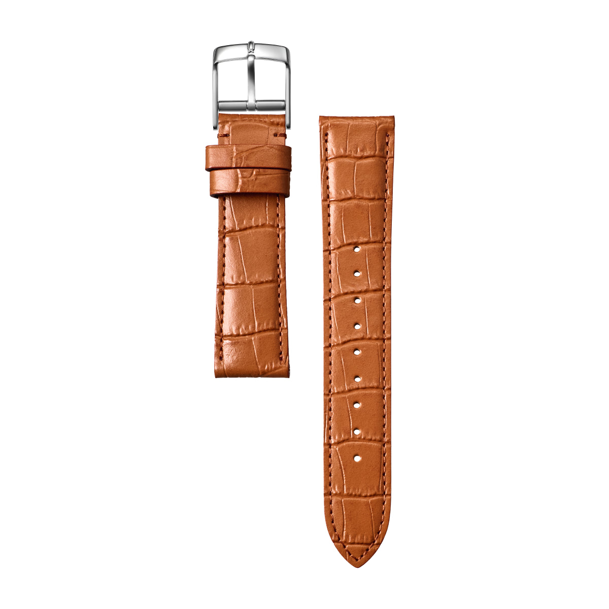 国内でなめした高品質なレザーに細かい凹凸を繊細に表現する日本の型押し技術を用い、風合い豊かなクロコダイルスタンパードレザーに仕上げたストラップ
