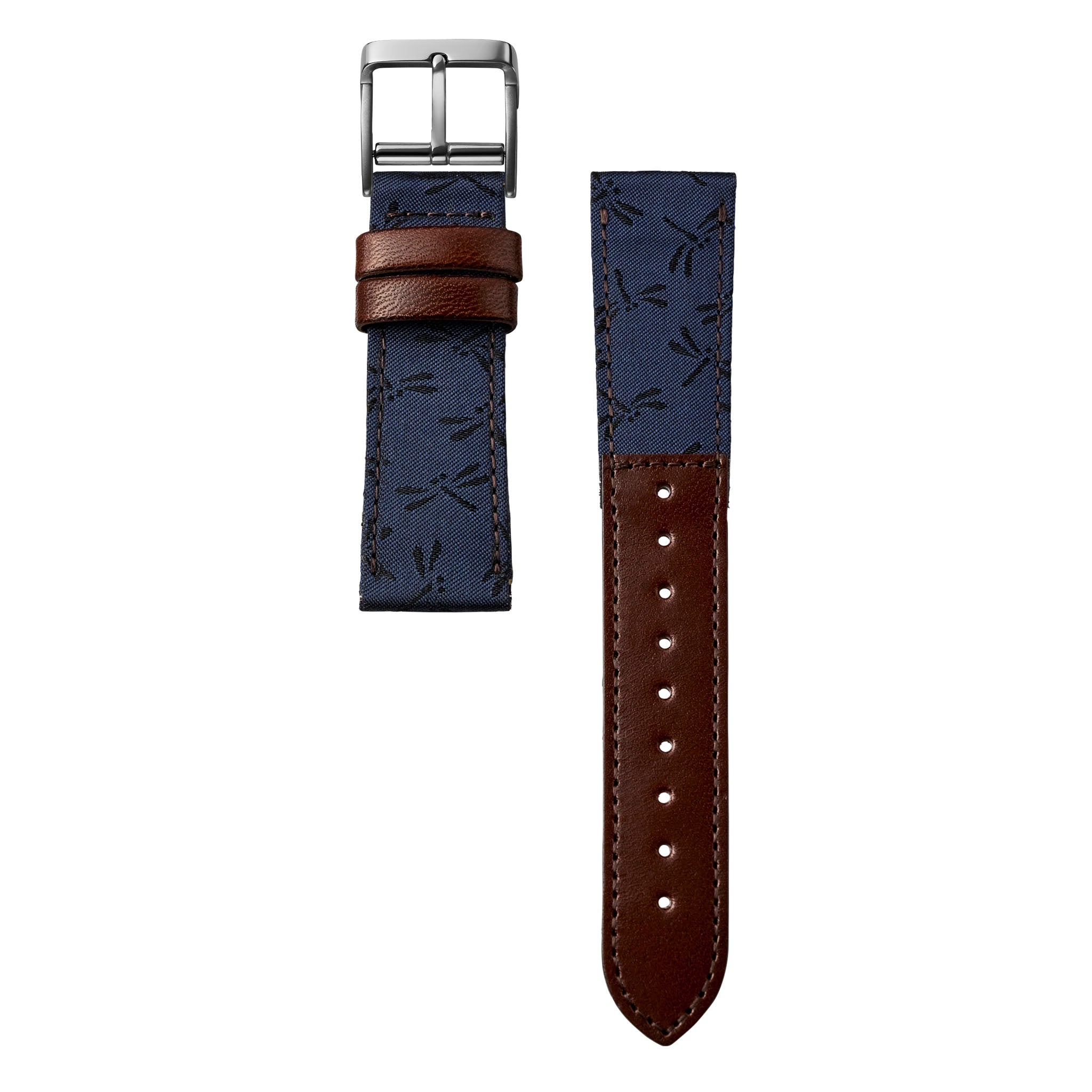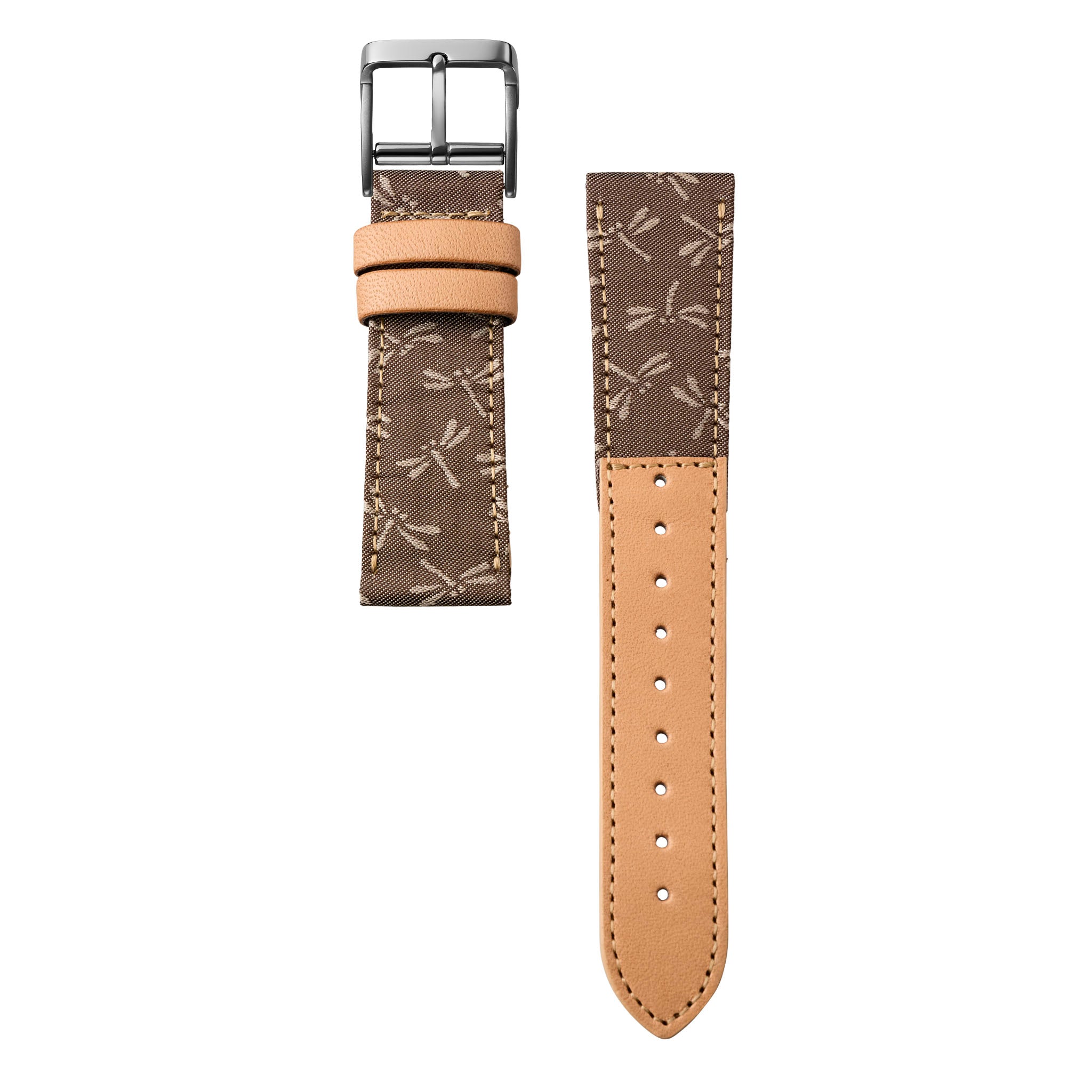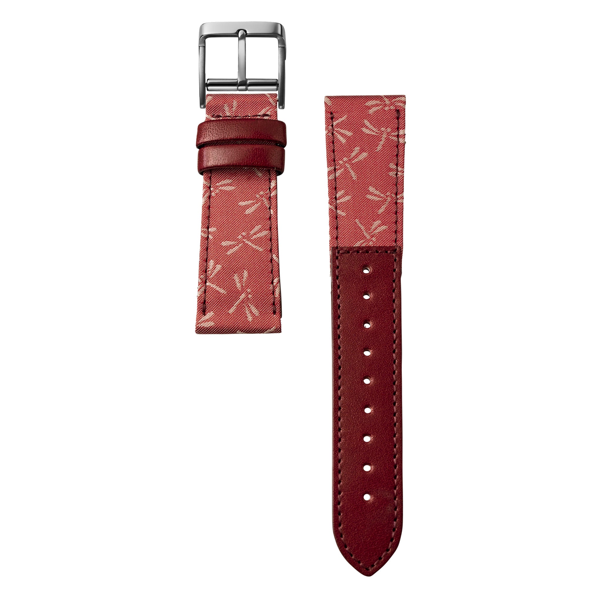 トンボは前に向かって飛び続けて後退しないことから、昔から縁起物として『勝ち虫』と呼ばれ戦国武将たちの甲冑などに使用されてきました。武田信玄などの武将が愛用していたところから山梨にはトンボのモチーフが多く残ります。槙田商店の傘でも使用されているトンボ柄をKnotのベルトでも採用しました。