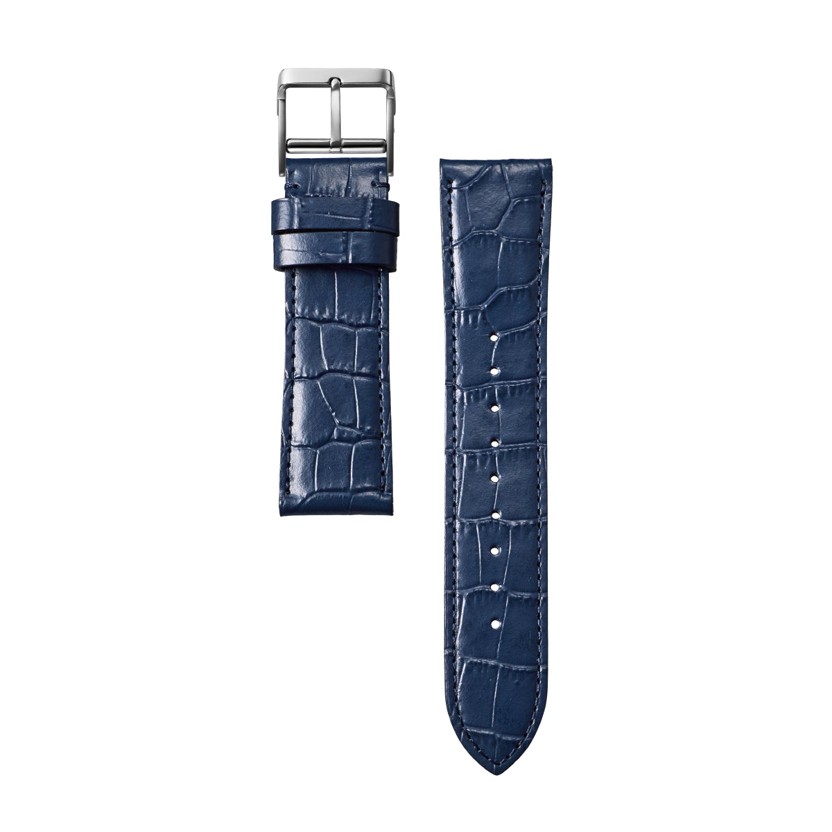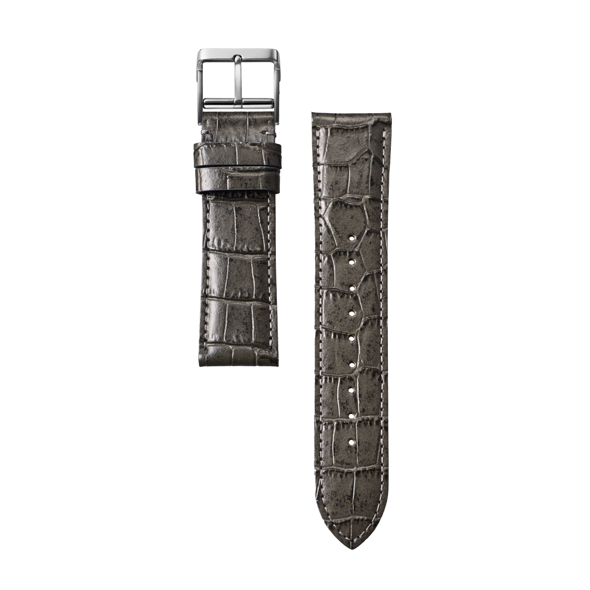 国内でなめした高品質なレザーに、細かい凹凸を繊細に表現する日本の型押し技術を用い、風合い豊かなクロコダイルスタンパードレザーに仕上げたストラップ
